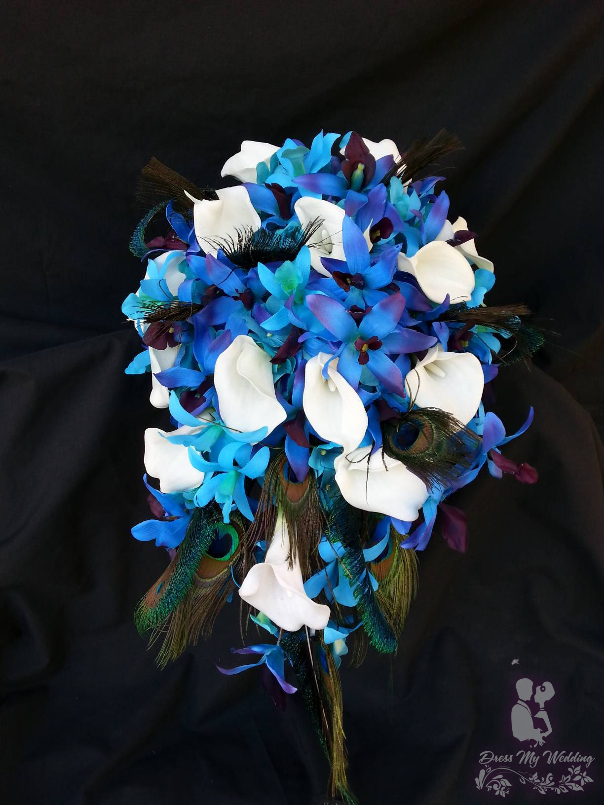 This exotic blue orchid bouquet is made with hand painted blue, turquoise, royal blue and blue purple dendrobium orchids, real touch ivory calla lilies, turquoise hydrangeas, real touch greeneries, and natural peacock eye feathers.