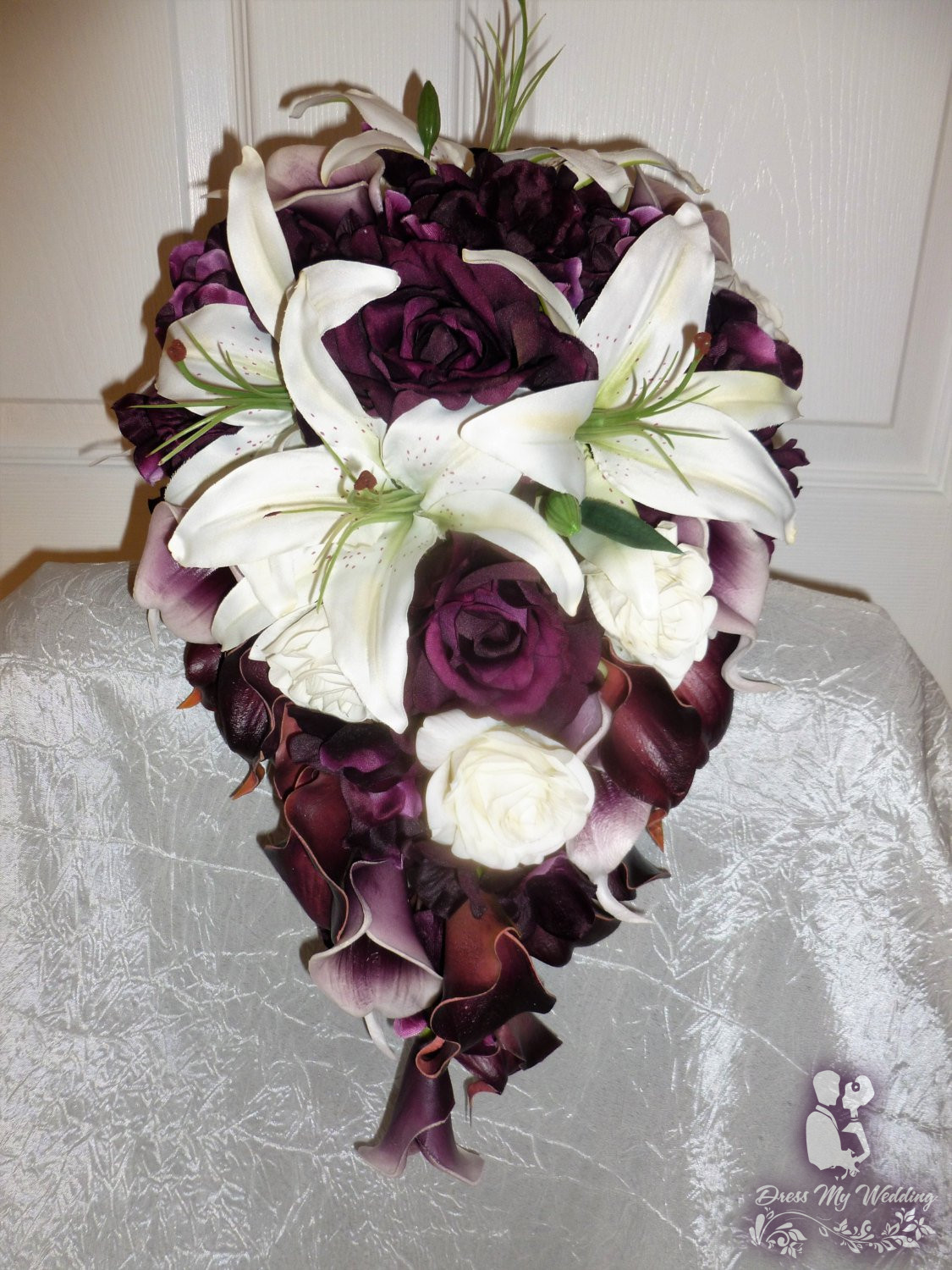 This cascading plum and ivory bouquet is made with high quality fabric/silk plum roses, plum hydrangeas, ivory stargazer lilies, ivory real touch roses, plum and plum Picasso calla lilies.