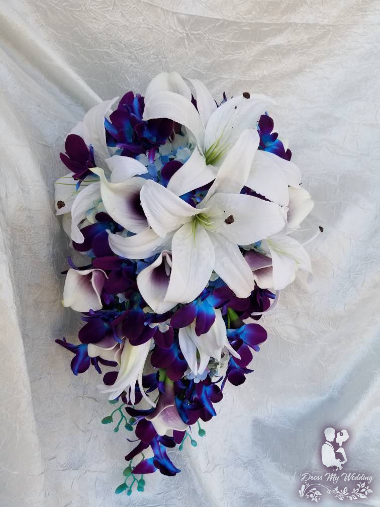 This beautiful galaxy orchid bouquet is made with artificial real touch white Casablanca lilies, hand painted galaxy orchids, real touch picasso calla lilies, and blue hydrangeas. Measures 12″ wide and cascades up to 21″.