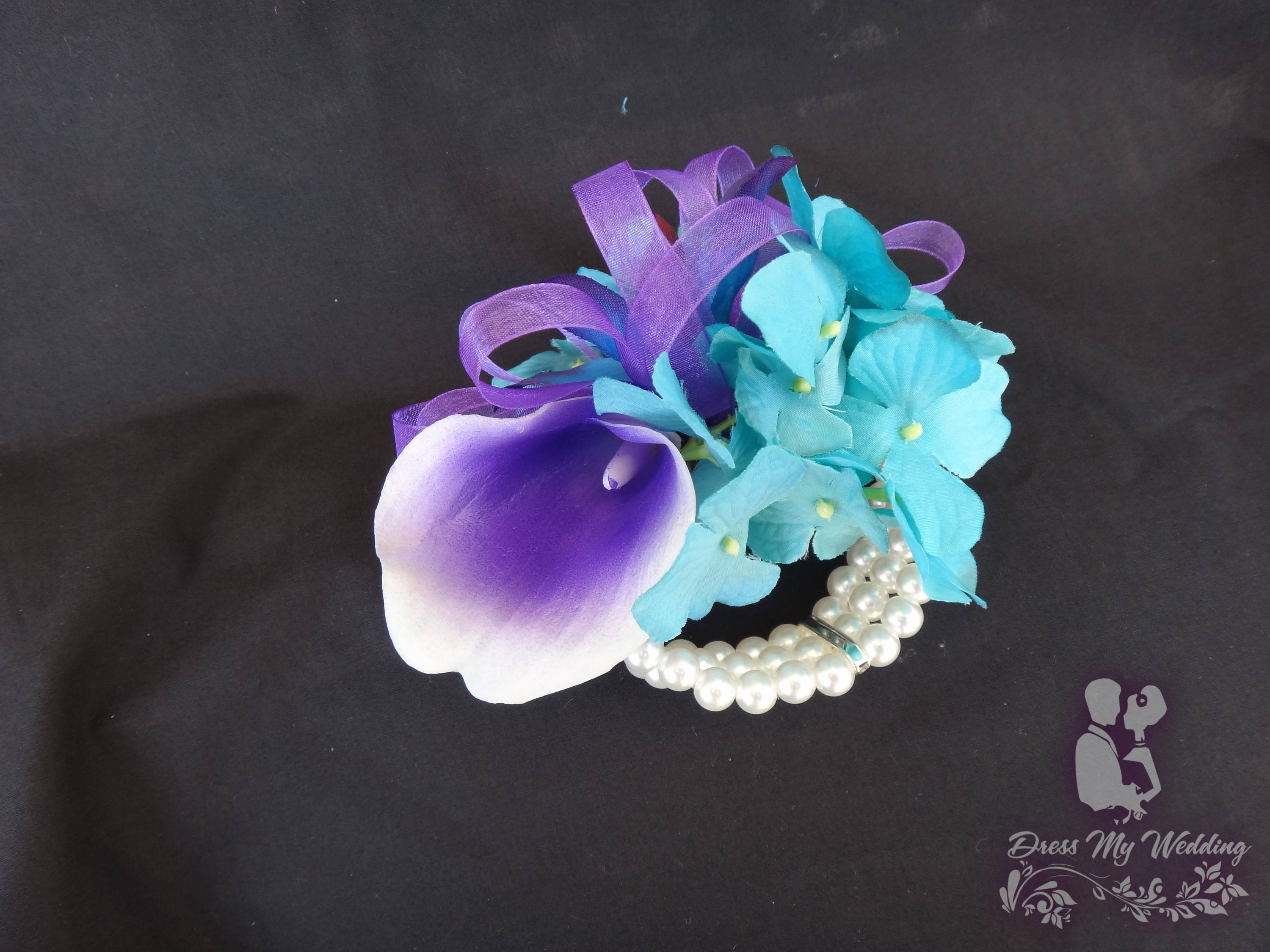 This beautiful wristlet is made with a white real touch calla lily, a purple blue orchid, turquoise hydrangeas and purple organza ribbon. Whole piece is attached to white or ivory wristlet.